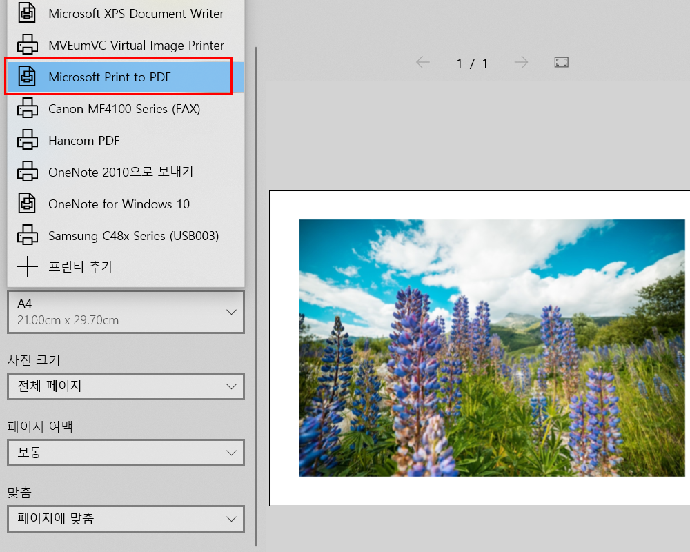 프린터를 클릭 해 주면 선택할 수 있는 프린터 목록이 나오는데, 이 중에 Microsoft Print to PDF 라는 목록이 있습니다. 한글로 메뉴가 표시되는 분은 'PDF로 저장'이라고 표시 될 텐데요. 이 부분을 클릭 하고, 아래 인쇄 버튼을 눌러 줍니다. 인쇄 버튼이지만 실제로는 출력이 되지 않고 JPG PDF 변환이 되는 것이니 걱정하지 말고 클릭 하셔도 됩니다.