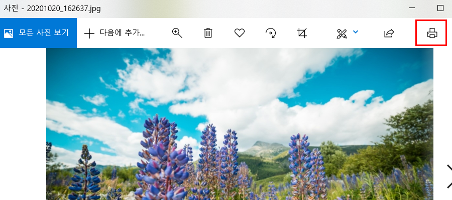 기본 사진 프로그램으로 JPG 파일을 열었다면 우측 상단에 있는 프린터 모양 아이콘을 클릭 해 줍니다. 해당 메뉴는 단순히 출력만을 실행하는 것이 아니라, JPG PDF 변환 프로그램 설치 없이 JPG PDF 변환이 가능하게 해 주는 기능도 있습니다.