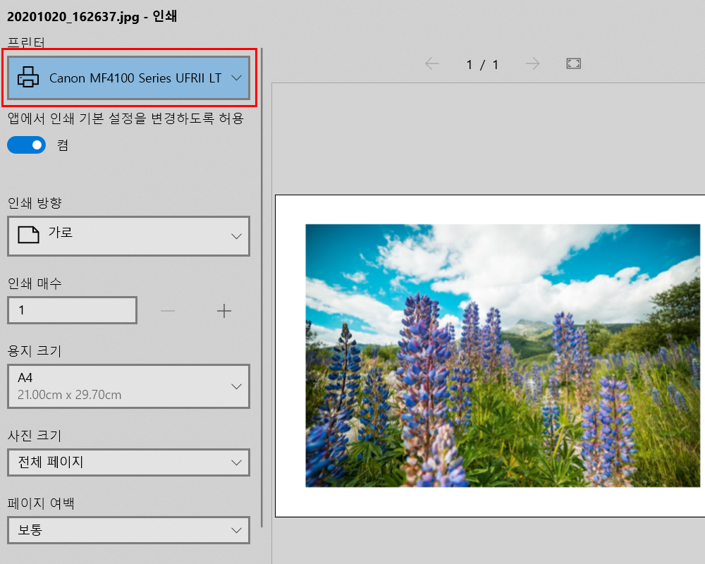 저희집에는 캐논 프린터기가 설치되어 있어 캐논 프린터가 가장 상단에 나오게 됩니다. 다른 분들은 개인 피씨 환경에 맞게 설치되어 있는 프린터가 기본을 뜰 텐데요. 그 부분을 클릭 해 줍니다.