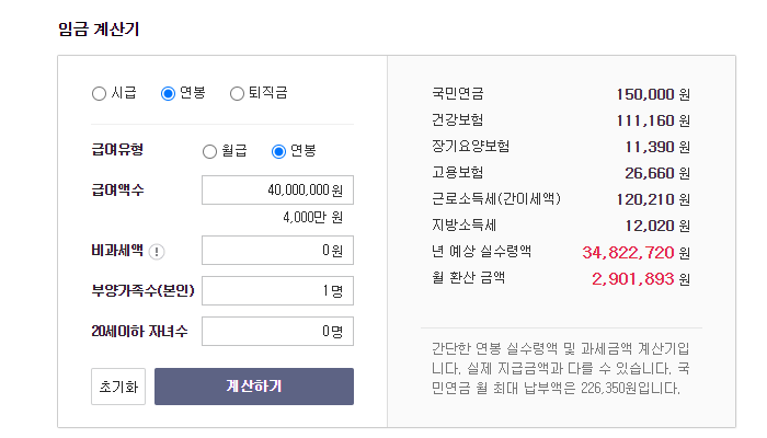 연봉 4000 실수령액은 daum 연봉계산기에서 쉽게 계산 할 수 있습니다. 먼저 가장 실수령액이 적은 경우를 실수령액 계산기로 계산 해 보았는데요. 부양가족수가 전혀 없는 상태에서, 회사에서도 전액을 과세 금액으로 지급하는 경우입니다. 이 때 년 예상 실수령액은 34,822,720원이고, 월급은 약 2,901,893원이 됩니다.