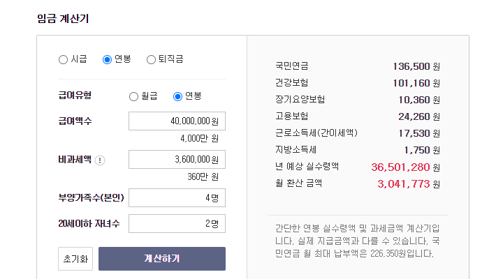 그렇다면 똑같이 연봉 4000만원을 받으면서 부양가족이 4명이고, 그 중 2명이 어린 자녀이며, 회사에서 월 30만원 정도는 비과세로 식비, 차비 등의 명목으로 따로 주는 회사는 어떨까요? 이 경우 연봉 4000만원 실수령액이 3,041,773원입니다. 위 경우와 약 14만원 정도가 차이 나는 셈 인데요. 사회 초년생에게는 결코 작지 않은 숫자라고 할 수 있겠습니다.