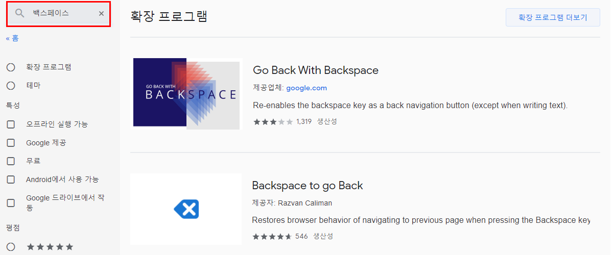크롬웹스토어에 들어가면 좌측 상단에 검색어를 입력할 수 있는데요. 간단히 백스페이스, 혹은 크롬 백스페이스 라고만 입력 해 주어도 크롬 뒤로가기 단축키 설정이 가능한 다양한 확장프로그램들이 나옵니다. 원하는 프로그램을 선택하여 설치하면 모든 과정이 끝나는데요. 개인적으로는 가장 리뷰가 많고 다운로드수가 많은 것을 이용하는 것을 권해 드립니다.