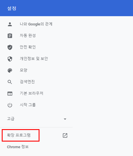 좌측의 확장프로그램을 클릭 하면 현재 내 크롬 브라우저에 설치되어 있는 여러 가지 확장프로그램 목록이 나옵니다. 하지만 크롬 뒤로가기 단축기를 설정하지 않았다면 지금 상태에서는 필요 한 확장 프로그램이 없겠죠? 때문에 좌측 가장 하단에서 Chrome 웹 스토어 열기를 클릭 해 주어 크롬 백스페이스 단축기를 설정 해 줍니다.
