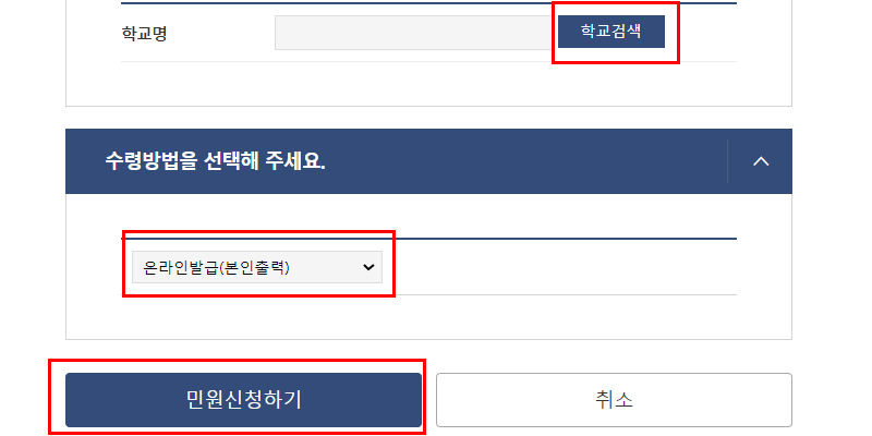 학교를 검색 한 다음에는 수령 및 발급 방법을 선택 하면 신청이 끝납니다. 고등학교 성적증명서 발급을 온라인으로 해서 직접 출력 하는 것도 가능하지만, 대학교 수시 원서를 접수 할 때에는 해당 대학의 담당자에게 직접 정부24에서 메일을 발송할 수도 있으므로 수령 방법을 잘 선택 해 주면 좋습니다.