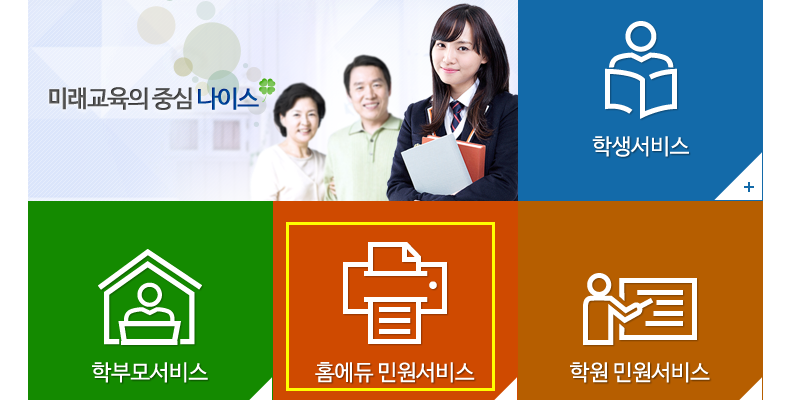 나이스는 교육행정 정보 시스템 (NEIS)인데요. 이 곳에서 고등학교 성적증명서와 함께 고등학교 생활기록부, 고등학생 졸업증명서 등을 출력 할 수 있습니다. 먼저 포털에서 나이스 라고 검색해서 메인 화면에 들어 간 다음, 중앙의 홈에듀 민원서비스를 클릭 해 줍니다.