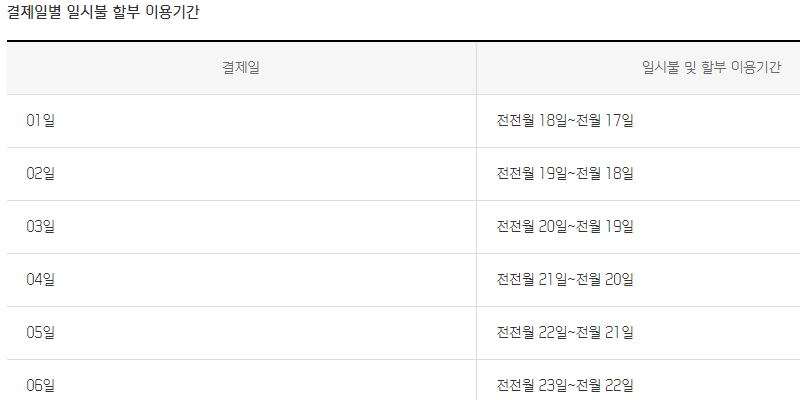 신한카드 홈페이지에 보면 신한카드 결제일별 이용기간이 나와 있습니다. 앞서 언급한 대로 1일부터 말일까지의 금액이 결제 되게 하려면 결제일을 14일로 지정 해 두면 좋습니다.