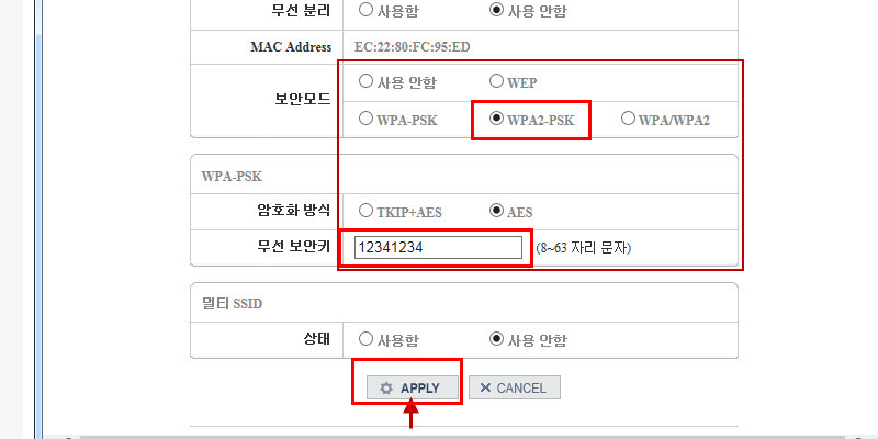 하지만 앞서 언급하였듯이 와이파이 비밀번호 설정은 필수적으로 해야 하고, 와이파이 비번 바꾸기도 주기적으로 해 주는 것이 좋은 만큼 우리는 여기서 보안모드를 WPA2-PSK로 설정 해 줍니다. 하단에 무선 보안키를 입력하고 APPLY를 누르면 와이파이 비번바꾸기가 끝납니다. 와이파이 비번 설정을 할 때에도 마찬가지로 같은 과정을 거치면 됩니다.