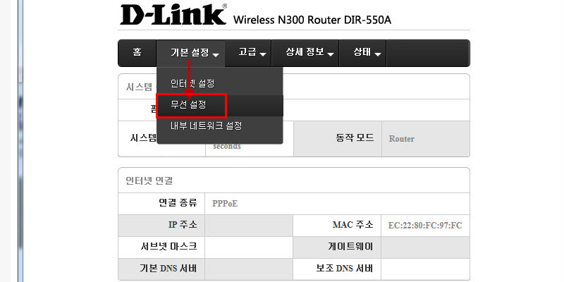 상단의 기본설정 버튼을 누르면 아래에 무선설정 탭이 있는데요. 여기로 들어가면 와이파이 이름을 설정할 수 있고, 와이파이 비밀번호 변경을 할 수 있습니다.