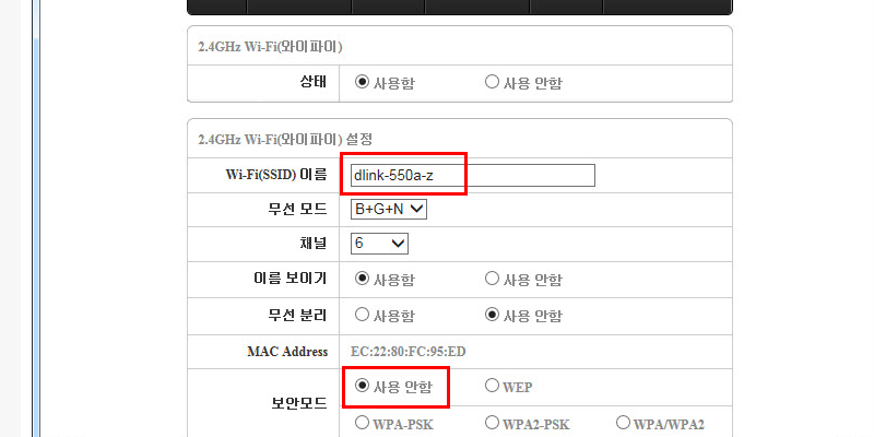 기본적으로 와이파이 이름은 공유기 모델명으로 되어 있습니다. 이 상태에서 와이파이 이름 변경을 위해서는 그대로 빈 칸에 내가 원하는 이름을 넣기만 하면 됩니다. 스크롤을 약간 하단으로 내리면 보안모드가 나오는데요. 여기서 보안모드를 사용안함으로 선택하고 APPLY를 누르면 비밀번호 없이 와이파이 설정이 끝납니다.