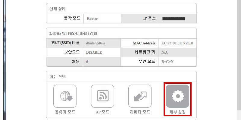 로그인을 하면 설정 화면이 나오는데요. 여기에서 톱니바퀴 모양으로 되어 있는 세부 설정 아이콘을 눌러 설정 화면으로 들어 가면 와이파이 비번 바꾸기가 가능합니다.