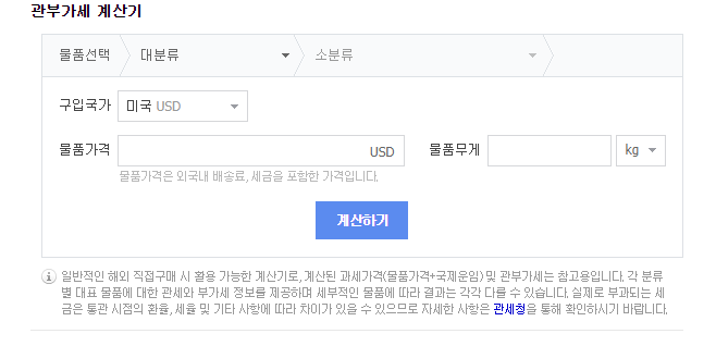 해외에서 물건을 구매 할 때에는 공항에서 수출입 통관센터를 거치게 되는데요. 의류 등 목록통관이 가능 한 물건에 대해서는 구입가 기준 200$까지, 일반 통관 물건에 대해서는 150$까지 관세가 면제되고, 그 이상에 대해서는 관세를 물어야 하므로 반드시 관부가세계산기를 통하여 미리 계산 해 보는 것이 좋습니다. 또 환율이나 운송비 등 여러 가지 조건에 따라 세액이 달라질 수 있으므로 반드시 어느 정도 여유를 두고 자금을 준비 해 두는 것도 필요합니다.