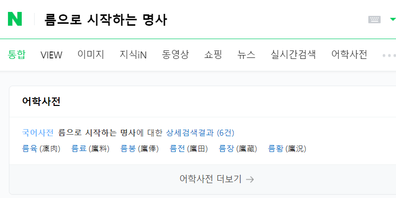 물론 끝말잇기를 할 때에는 대부분 명사만 인정하고 동사, 형용사, 부사 등은 인정하지 않기 때문에 끝말잇기를 위해서는 름으로 시작하는 명사를 찾아 보았는데요. 우리나라에서는 두음법칙으로 인하여 름이 명사 제일 앞에 올 경우에 음이나 늠으로 대체 되기 때문에 국어사전에 있는 름으로 시작하는 단어는 명사만 찾을 경우 북한 명사 6가지가 전부입니다. 그렇지만 끝말잇기 이기는법을 찾는다면 북한어까지 알고 있어야 한다는 점!