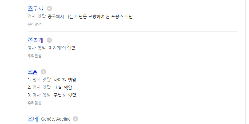 즈로 시작하는 단어는 여러 가지가 있는데요. 생각보다 많은 단어가 있지만 그 중에서 부사, 형용사 등은 끝말잇기에 쓰이지 않으므로 명사만 추려 모아 보았습니다.