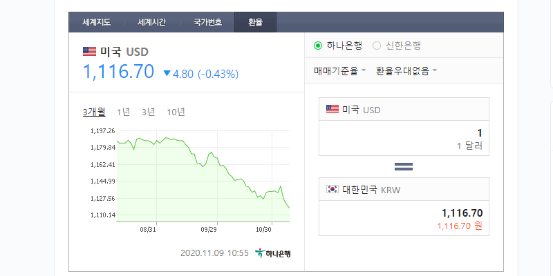 네이버에서 미국환율을 검색 하면 위와 같은 화면이 나옵니다. 여기서 오늘의 환율과 최근 추세 정도는 바로 확인 할 수 있는데요. 환전 계획이 있다면 이용하는 은행의 매매기준율을 확인 할 수 있고, 여기서 다시 환율 화면을 클릭 하면 날짜별 환율조회 내용을 볼 수 있습니다.
