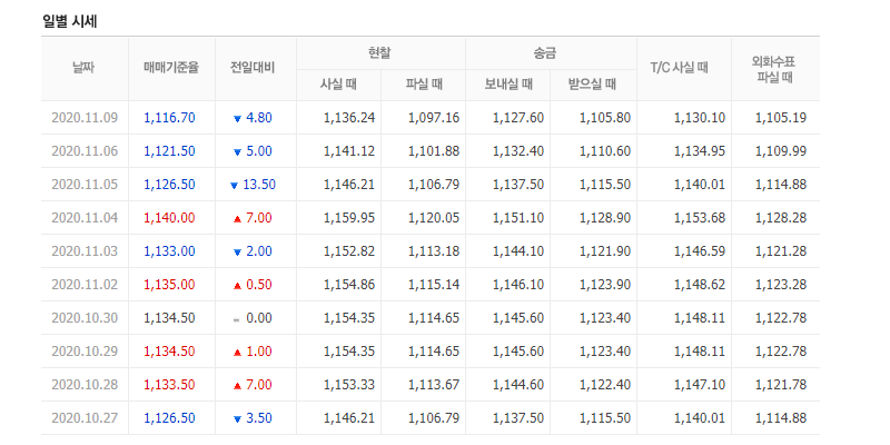 스크롤을 아래로 조금 더 내리면 이렇게 일별 시세가 나옵니다. 원하는 날짜로 페이지를 이동하면 날짜별 환율조회가 가능하고, 고시회차별 환율조회도 가능 합니다.