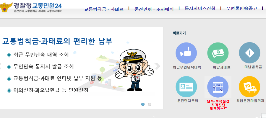그 외에도 본인이 난폭운전, 보복운전 등으로 신고 당할 수 있는지를 체크하는 자가진단 체크리스트와 함께 착한운전 마일리지, 미납 과태료 조회 등 여러 가지 메뉴가 있는데요. 필요 할 때 마다 조회 해 볼 수 있고 납부도 여기에서 가능한 유용한 기능이니 즐겨찾기에 저장 해 두시는 것도 나쁘지 않겠습니다.