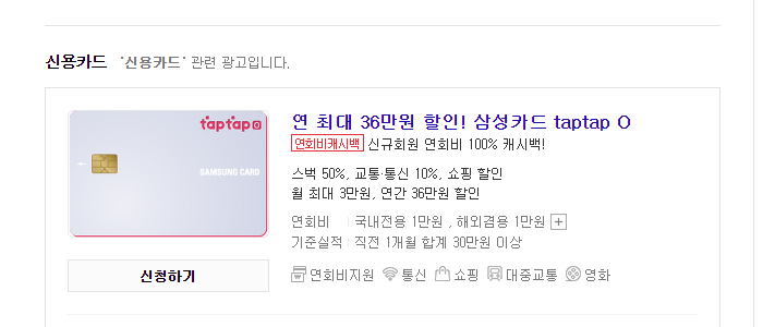 삼성 탭탭오카드의 연회비는 연 1만원인데요. 국내전용, 해외겸용의 구분이 없이 모두 1만원으로 동일합니다. 대중교통 할인 혜택을 받기 위해서는 후불 교통카드 기능을 넣어서 발급 신청 해야 하므로 이 부분은 신청시 주의가 필요합니다.