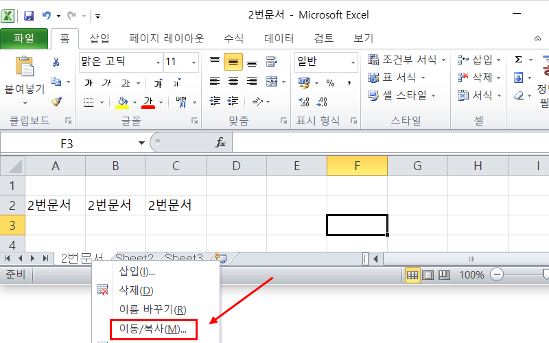 2번 문서를 1번 문서의 2번째 시트로 옮기기 위하여 2번문서 탭에서 우클릭을 해 줍니다. 이름 바꾸기를 비롯한 몇 가지 메뉴가 나오는데요. 여기에서 이동/복사(M) 항목을 클릭 해 줍니다.