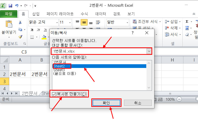 엑셀 파일 합치기를 위해서는 병합하고자 하는 엑셀 파일이 두개 다 열려 있어야 합니다. 파일이 모두 열려 있는 상태라면 위 화면에서 '대상 통합 문서'에 1번 문서가 보일 텐데요. 기본으로는 2번 문서가 선택되어 있지만, 선택 창을 클릭하여 1번 문서로 바꾸어 줍니다. 그러면 1번 문서의 시트가 하단에 나오는데요. 어느 위치에 내가 2번 문서 시트를 합치기 할지 그 위치를 지정 해 줍니다. 2번 문서를 삭제 하지 않으려면 복사본 만들기를 함께 체크 하고, 확인 버튼을 눌러 줍니다.