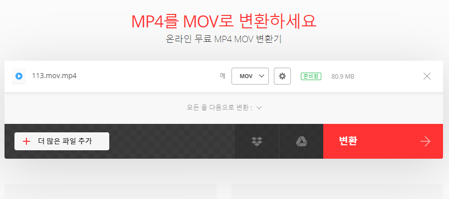 저는 mov파일을 가지고 있지 않아 mov mp4 변환을 하지 않고 반대로 mp4 mov 변환을 해 보았는데요. 이미지와 같이 아까 그 점 세개를 눌러 mov 부분을 선택 해 주었습니다. 그 다음에는 변환 버튼을 누르면 mov mp4 변환이 시작 됩니다.
