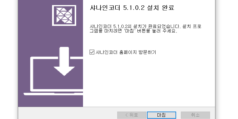 이제 샤나인코더 다운로드와 설치가 끝났습니다. 샤나인코더 홈페이지 방문하기 부분을 체크 해제 하고 마침 버튼을 클릭 해 줍니다.