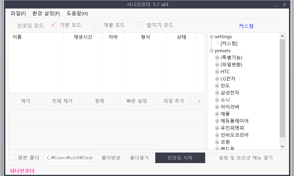 샤나인코더 다운로드 후에는 사용 방법은 어렵지 않은데요. 좌측 상단의 파일 메뉴를 클릭하여 파일을 추가 해 주고, 인코딩을 원하는 파일 형식을 정한 다음 인코딩 시작 버튼만 눌러주면 샤나인코더 실행이 끝납니다. 이 부분이 어렵게 느껴지는 분은샤냐인코더 다운로드 바로가기를 클릭하여 샤나인코더 사용 팁 게시판과 샤나인코더 질문 및 답변 게시판을 참고 하시면 도움이 될 것으로 보입니다.