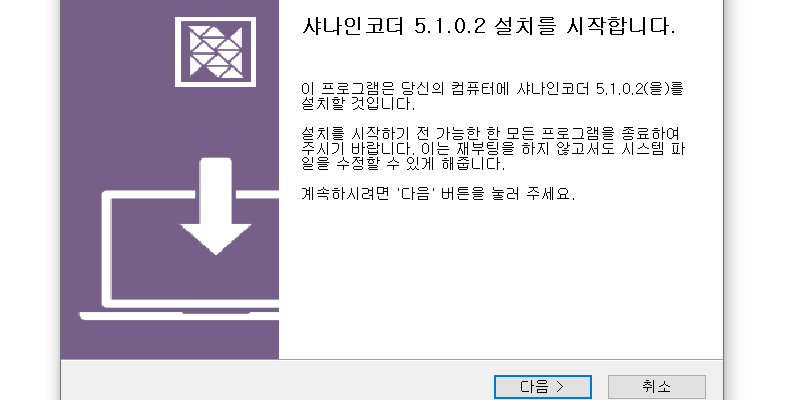 이제 샤나인코더 설치 시작 화면이 나오는데요. 다음 버튼을 눌러 주세요.