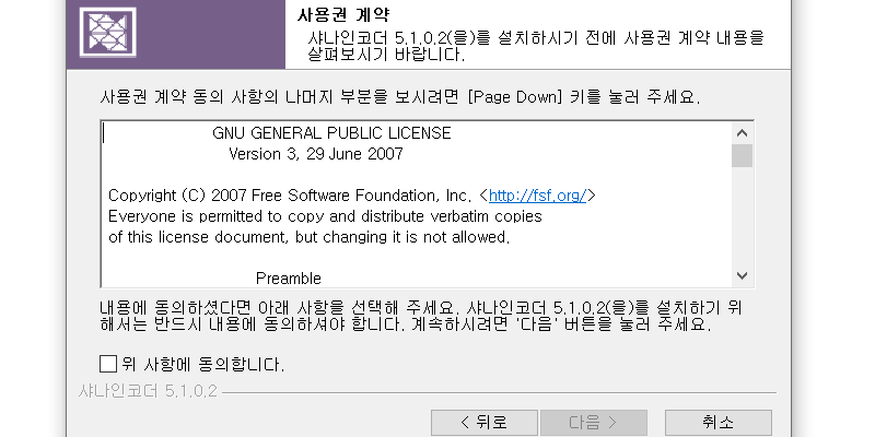 기본적인 약관 동의 페이지가 나옵니다. 위 사항에 동의합니다 부분에 체크 한 다음에 '다음' 버튼을 클릭 해 주세요. 샤나인코더 설치를 위해서는 약간 동의 페이지 2곳에 체크를 하고 다음을 클릭 해야 합니다.