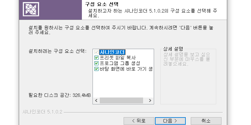 샤나인코더 설치를 위한 약관 동의가 끝나면 이제는 설치 요소 선택이 가능한데요. 기본값을 셋팅 해 줍니다.