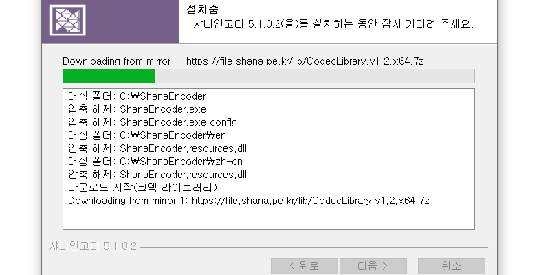 이제 샤나인코더 설치가 진행 되는데요. 시간이 오래 걸리지 않으니 잠깐 기다렸다가 다음 부분을 클릭 해 주시면 됩니다.