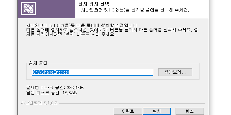 설치하고자 하는 폴더를 정하는 화면입니다. 샤나인코더를 C 또는 D 등 원하는 드라이버에 설치 해 줍니다.
