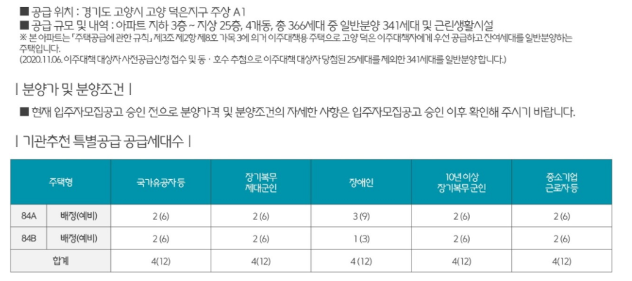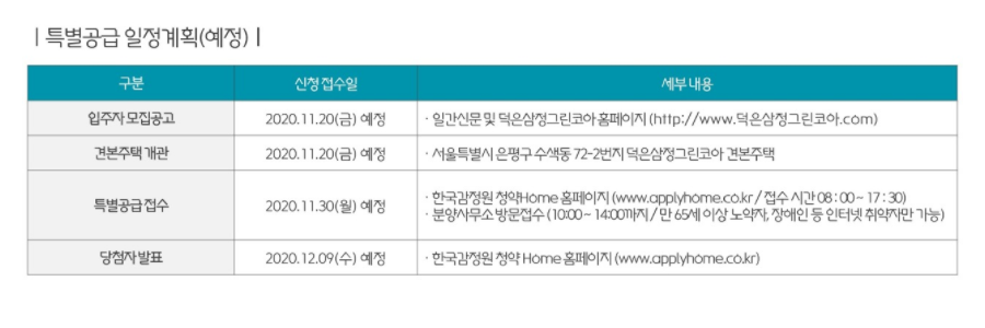 덕은 삼정그린코아 더베스트 입주자 모집공고는 11월 20일에 예정되어 있습니다. 모델하우스도 이 날 함께 오픈 되는데요. 특별공급 접수는 11월 30일, 당첨자 발표일은 12월 9일로 예정되어 있으므로 일반공급도 그에 맞게 예상 하면 될 것으로 보입니다. 전체 평형이 84형으로 이루어 져 있어 전용면적 85 이하에 해당하며, 경기도에 위치한 만큼 청약통장 예치금은 200만원으로 준비 하면 됩니다.