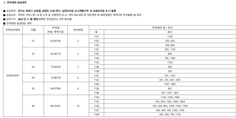 이번 e편한세상 남양뉴타운 잔여세대는 총 48세대가 나왔는데요. 이러한 잔여세대 무순위청약은 줍줍인 만큼 별도의 청약통장이 필요하지 않고 만 19세 이상, 수도권에 거주만 하고 있다면 누구나 넣을 수 있어 경쟁이 더욱 치열합니다. 65타입이 총 10세대, 75타입이 9세대, 84타입이 29세대 나와 있는데요. 물량이 많은 만큼 경쟁률을 미리 잘 분석 하여 전략적으로 접수 하면 당첨의 기회가 클 수도 있을 것으로 보입니다.