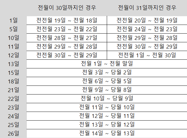 삼성카드 결제일별 이용기간은 위 표와 같습니다. 보시다시피 전월이 30일 까지인지 31일까지인지에 따라 결제일이 조금 다른데요. 1~12일 사이를 결제일로 지정하면 이런 문제가 생기므로, 이러한 구분이 번거롭게 느껴진다면 결제일을 13일로 지정하면 전월 1일에서 말일까지 사용 한 금액을 낼 수 있어 계산이 한결 간편해 질 수 있습니다.