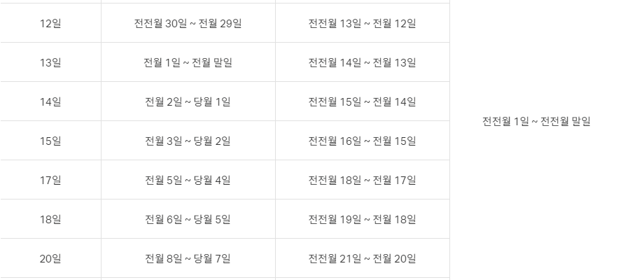 삼성카드 우리카드 농협카드 신한카드 결제일별 이용기간