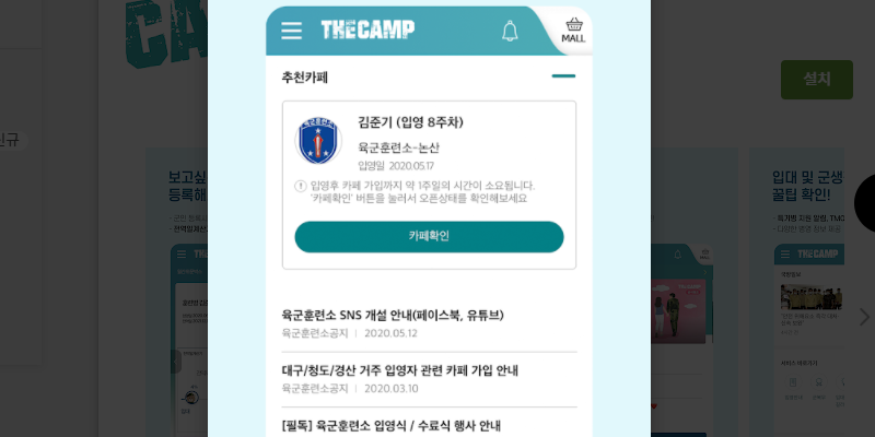 보고싶은 군인 등록하기를 하면 육군 더캠프 인터넷편지 작성이 가능한데요. 갓 입대 한 훈련병이라면 1주일정도 카페가 확인 되지 않을 수도 있어요. 카페를 개설 하기까지 조금 시간이 걸리니, 기다리면서 카페 개설이 되었는지 카페확인 버튼을 눌러 체크 해 보는 것도 좋습니다.