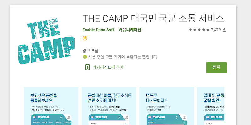 더캠프 인터넷편지를 쓰기 위한 어플은 구글 플레이스토어에서 더캠프로 검색 하면 쉽게 찾을 수 있습니다. 간단히 설치 버튼을 눌러 다운로드 및 설치를 해 주면 되는데요. 회원가입 후 로그인을 하면 더캠프 위문편지를 쓸 수 있습니다.