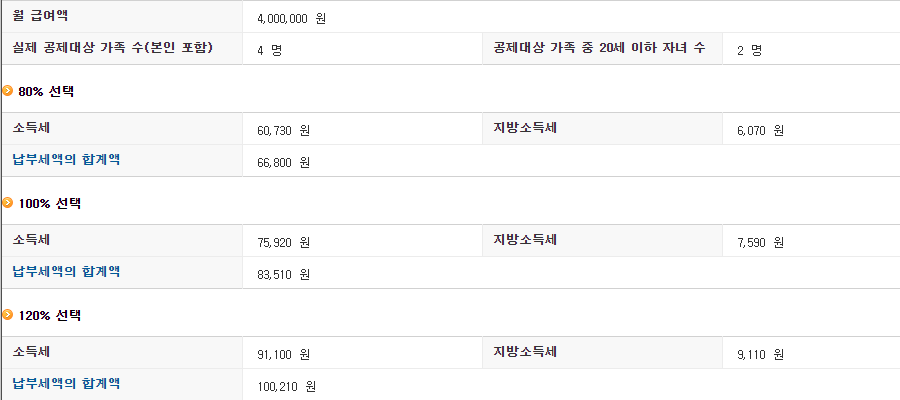 월 급여액 400만원, 미성년 자녀가 2명인 4인가족을 대상으로 갑근세 계산기를 돌려 본 결과입니다. 소득세와 지방소득세의 합은 83,510원인데요. 80%를 선택 하느냐, 120%를 선택 하느냐에 따라 내야 할 납부세액의 합이 66,000원에서 100,000원까지 차이가 나는 것을 볼 수 있습니다. 때문에 평소 지출 습관을 잘 파악하고 자금의 흐름을 고려하여 갑근세를 80%로 내야 할지, 100%나 120%로 내야 할지 선택 해야 할 것 입니다.