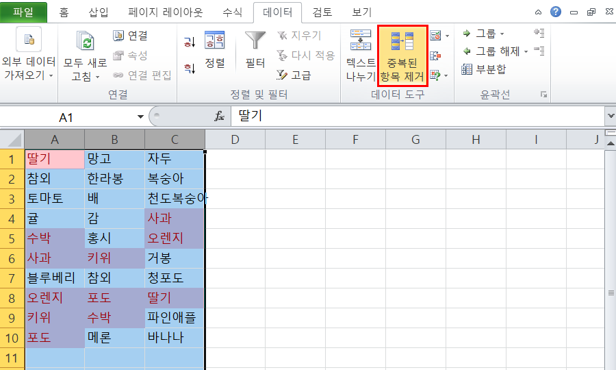 사실 많은 분들이 엑셀 중복값 찾기를 하는 이유 중 하나가 엑셀 중복값 제거를 위한 것이기도 한데요. 엑셀 중복값 삭제를 위해서는 또 다른 기능이 엑셀에 준비 되어 있습니다.
