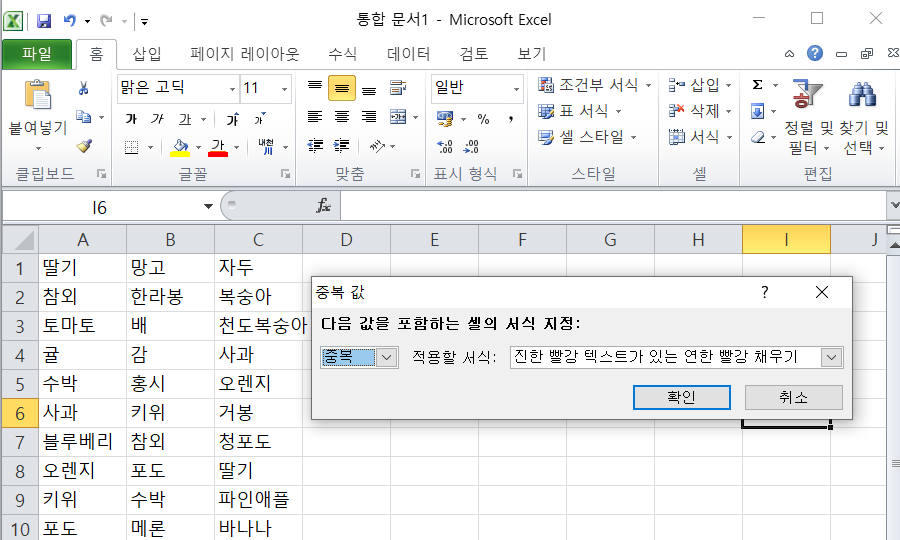 엑셀 중복값 찾기 메뉴로 들어가면 위와같이 중복이 되는 값을 어떻게 표시 할지를 묻는 창이 나옵니다. 기본값은 중복이 되는 메뉴를 연한 빨간 칸으로 채우고, 붉은 글씨로 바꾸게 되어 있는데요. 이 대로 적용을 해 보겠습니다.
