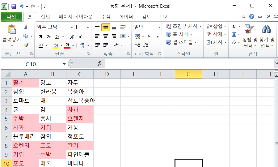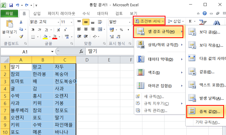 제가 테스트를 위해 임시로 만든 엑셀 창입니다. 과일 이름이 나열되어 있고 그 중 중복된 것들이 몇 개 있는데요. 여기에서 엑셀 중복값 찾기를 하기 위해서는 먼저 찾고자 하는 대상 영역을 선택 해 주어야 합니다. 스크롤을 이용해서 찾고자 하는 대상이 되는 영역을 선택 해 준 다음에 메뉴를 선택 해야 합니다.