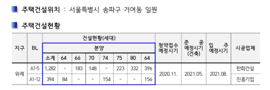 위례 A1-5, A1-12 공공분양의 경우 위치가 서울특별시 송파구 거여동 일원입니다. 행정구역상 송파구라는 뜻 인데요. 때문에 시세차익을 얻기 위해 청약을 넣을 분들이 굉장히 많은, 일명 "로또 분양"이라고 할 수 있을 것 입니다. 위례 A1-5는 1,282세대, 위례 A1-12는 394세대의 일반분양이 예정되어 있어 전략적으로 청약을 넣어야 당첨 확률을 조금이나마 높일 수 있습니다.