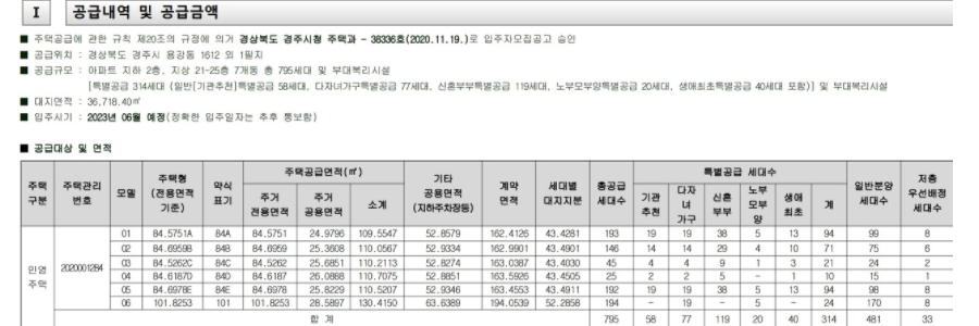 경주 뉴센트로 에일린의 뜰 입주자 모집 공고는 오늘, 11월 20일에 발표 되었습니다. 특별공급 접수는 12월 2일, 1순위 공급은 12월 3일인데요. 당첨자 발표를 12월 10일에 하고 12월 21일부터 3일간 계약 체결을 진행 합니다. 지하 2층에서 지상 21~25층에 이르는 총 795세대의 단지로, 최근 신축을 선호하는 현상을 생각 했을 때에 신혼부부 등의 수요가 충분히 있을 것으로 판단 됩니다.