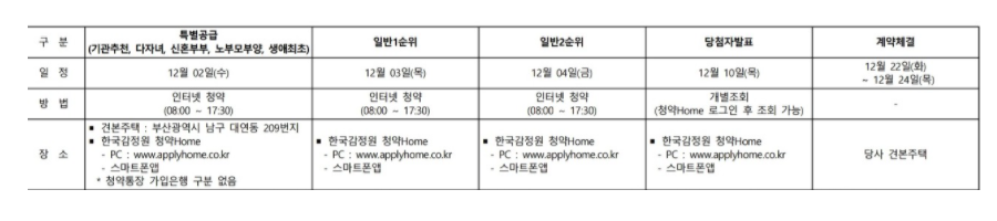 힐스테이트 남천역 더퍼스트 입주자 모집 공고일은 11월 20일로, 전입신고와 함께 청약통장 예치금이 모두 셋팅되어 있어야 합니다. 특별공급 접수가 12월 2일, 1순위가 12월 3일로 예정 되어 있고 당첨자 발표는 12월 10일입니다. 계약 체결은 12월 22일부터 3일간 이루어 지므로 이 때 까지 서류와 계약금을 준비 하시면 되겠습니다.