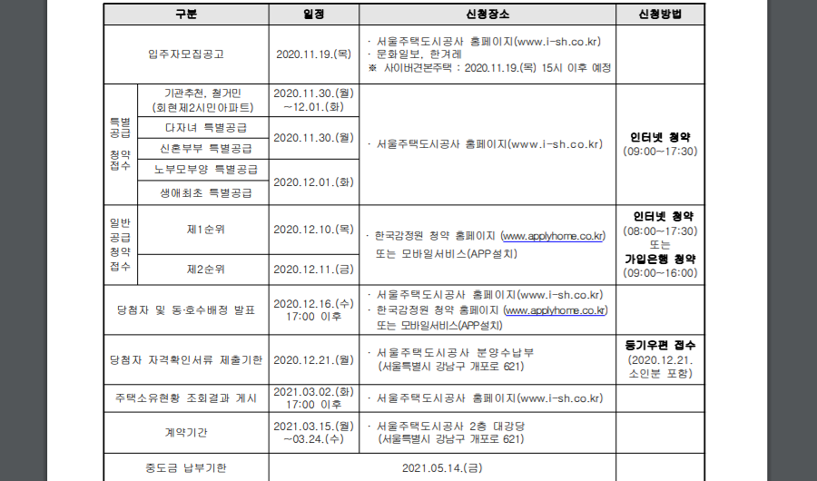 위례 A1-5, A1-12 위례포레샤인15, 17단지 입주자모집공고는 11월 19일에 홈페이지에 게시 되었습니다. 특별공급은 11월 30일~12월 1일에 진행 될 예정이며, 일반공급 1순위는 12월 10일, 당첨자 발표는 12월 16일, 서류 제출은 21일까지입니다. 위례 A1-5, A1-12 위례포레샤인 15, 17단지는 공공분양이기 때문에 2020년 12월 16일 청약 당첨자 발표로부터 10년간 전매가 제한됩니다.