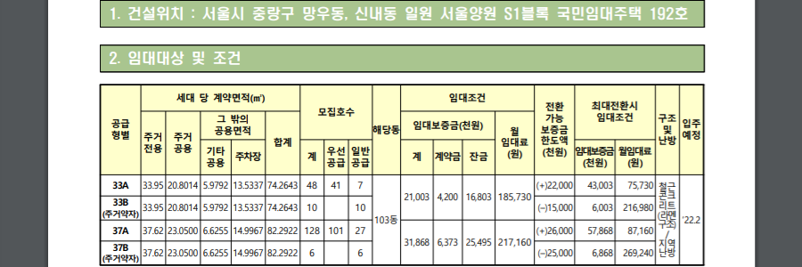 서울양원S1블록 국민임대는 보증금을 최대로 전환시 57,868,000원의 보증금에 우러 임대료 87,160원으로 거주 할 수도 있는데요. 서울 내에서는 찾아보기 힘든 월세 수준인 만큼 실거주를 위한 국민임대 아파트를 찾던 분들이라면 눈여겨 볼 만한 조건인 것으로 보입니다.