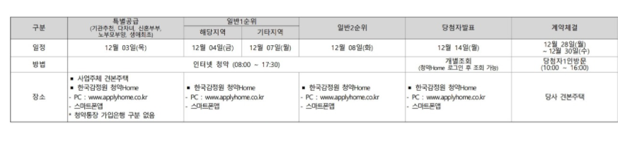 화성시청역 서희스타힐스 4차 숲속마을 입주자 모집 공고일은 11월 23일, 어제였습니다. 때문에 23일까지 청약 통장의 예치금과 가족구성원 전입 등이 모두 마무리 되어 있어야 하는 상태이고요. 특별공급 접수는 12월 3일, 1순위 공급은 12월 4일, 당첨자 발표는 12월 14일 진행 예정입니다. 계약 체결이 12월 28일이므로 그 전까지 계약금과 자금 조달 계획을 세워 두는 것이 중요합니다.