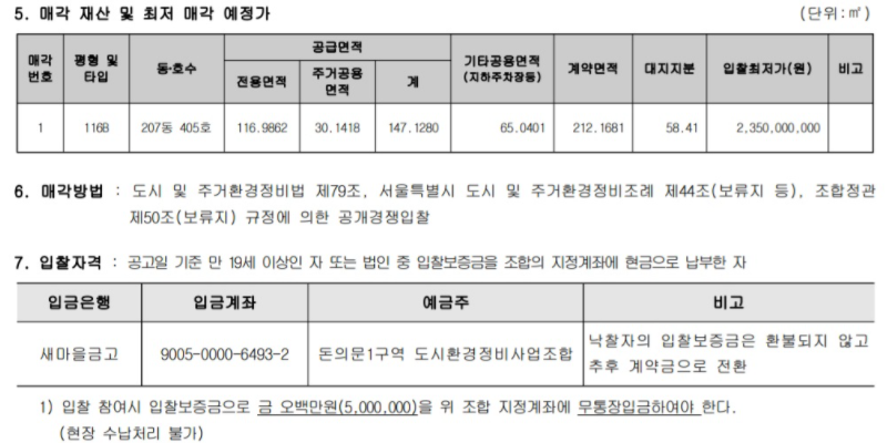 경희궁자이 보류지 매각 입찰 일정은 12월 1일 13시부터 55분간입니다. 1세대밖에 없기 때문에 짧게 진행하는 듯 한데요. 55분간 매각 입찰을 한 다음 바로 당일 14시에 개찰을 하기 때문에 즉시 결과를 알 수 있습니다. 입찰 보증금은 500만원으로 그리 크지는 않아, 최저 입찰 금액으로 입찰하고자 하는 분은 바로 입찰도 가능 할 것으로 보입니다.