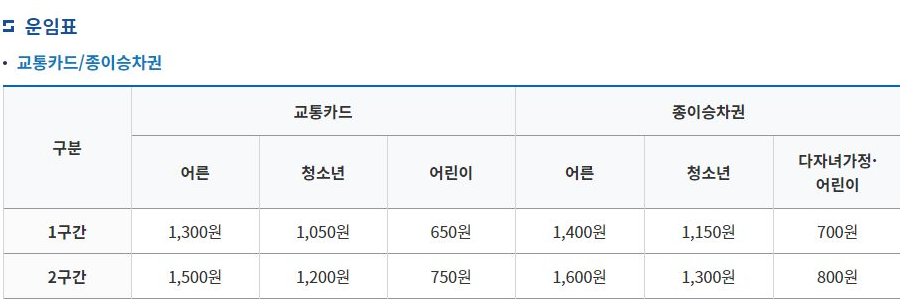 1구간은 출발지에서 10km이며, 1구간이 지나면 2구간으로 취급 됩니다. 부산 지하철 요금은 나이에 따라, 구간에 따라 다르니 이 두 가지를 조합하여 아래 표를 확인 하시면 되겠습니다. 단, 만 65세 이상 노인은 부산 지하철 노인요금이 무임으로 처리되어 별도의 운임 없이 승차가 가능합니다.