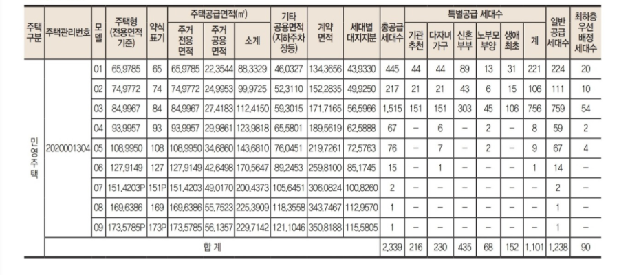 오산 롯데캐슬 스카이파크는 지하 3층, 지상 최고 23층에 이르는 18개동으로 이루어 져 있습니다. 총 2,339세대로 단독 단지로는 굉장히 대단지인데요. 이 중 특별공급이 1,101세대, 나머지가 일반공급으로 이루어 집니다. 65, 75, 85형의 세대수가 가장 많고, 그 중에서도 84형이 1,515세대로 절반 이상을 차지 하는 중소형 평형 위주의 단지입니다.